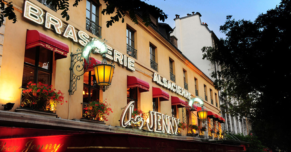 A real icon of the Place de la République, the Chez Jenny brasserie continues the grand tradition of Alsace’s culture and generous gastronomy. The authentic décor, with its signed Spindler panelling and magnificent floor mosaics, has helped create its reputation as one of the most beautiful brasseries in Paris. The Chef honours sauerkraut in all its forms, offers a wide range of seafood.