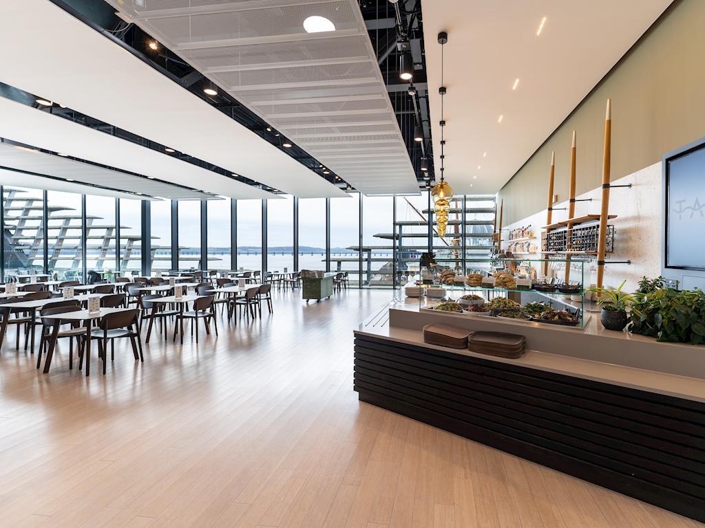 Located on the upper level with views towards the east of the city, this space has been designed with flexibility to allow use for a variety of corporate events, including seminars, workshops, lectures, meetings, and performances. Adjacent to the main restaurant kitchen, a full catering service